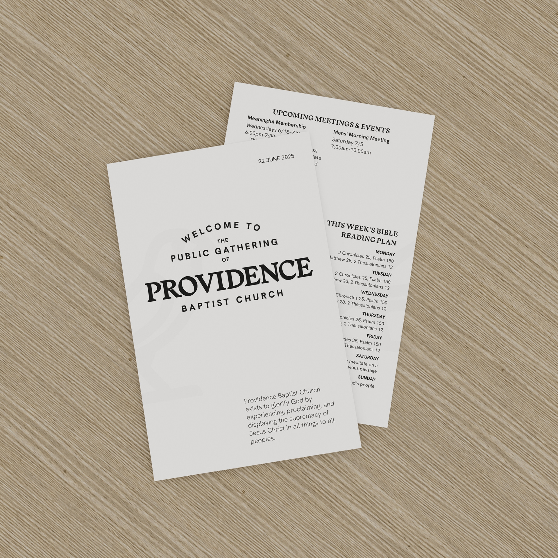 Design elements intentionally draw from historical references to align with the church’s focus on biblical and church history. The bird icon, inspired by hieroglyphs, uses a subtle hand-drawn quality. The Reformation-era serif and early grotesque sans-serif also introduce organic details. These characteristics combine to create a warm and inviting visual identity.